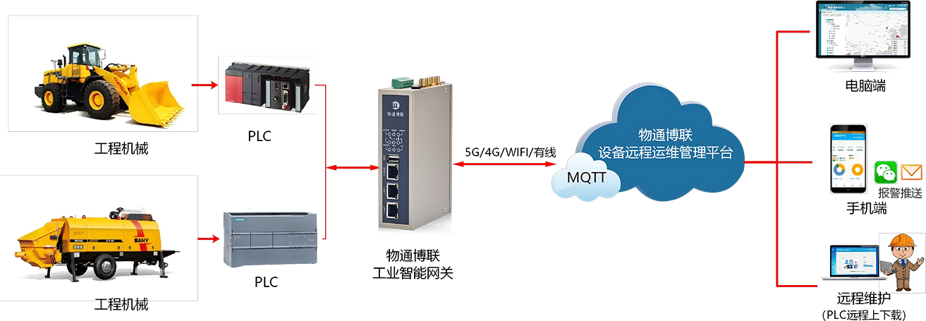 通过物通博联的工业智能网关,连接工程机械设备的控制器、传感器等设备,实时采集设备的位置信息、运行状态(如工作、空闲、故障等)、运行参数(如发动机转速、油压、水温等)、油耗等数据。将采集到的数据传输至设备运维管理平台,平台对数据进行分析和处理。当设备出现故障时,及时发出预警,并通过物通博联设备维护快线进行远程维护,提高维护效率,降低运维成本,实现设备全生命周期数字化管理。