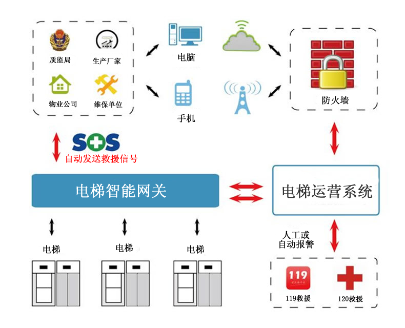 以物通博联工业智能网关为核心,通过串行/网口通信获取电梯控制器数据并进行本地计算分析后,把这些数据通过工业智能网关有线或无线网络安全可靠地传输到后台服务器,物通博联工业智能网关还具有短信发送和接收功能,可将电梯故障信息发送到维保人员、物业公司人员、应急处置服务平台人员的手机上,出现紧急情况,实现第一时间报警。电梯运行安全物联监控平台,通过调取后台服务器的数据,起到了统一管理、统一指挥、统一调度的功能。