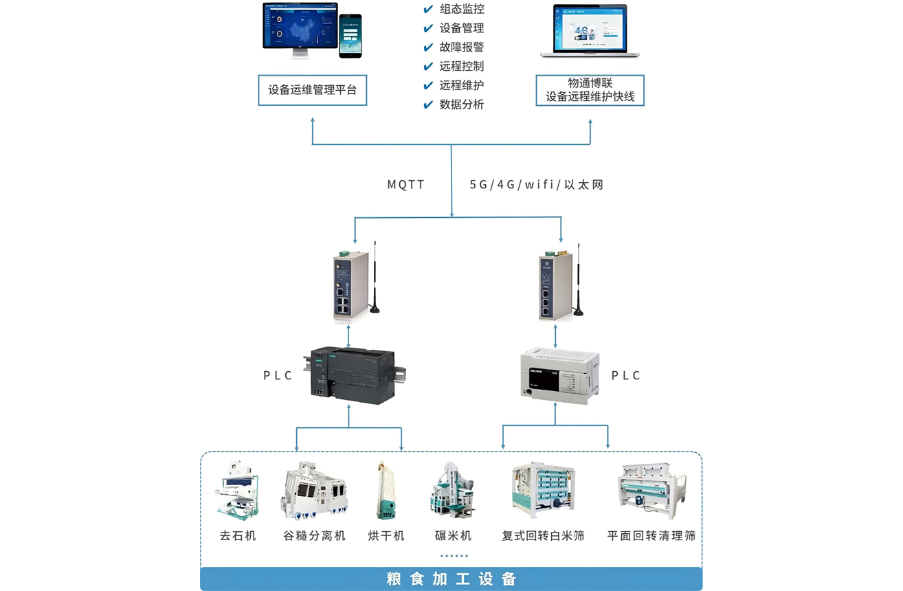 物通博联提供基于工业智能网关的粮食加工设备远程监控智慧运维系统解决方案。通过将去石机、碾米机、抛光机、烘干机的控制器PLC接入到物通博联工业智能网关,网关就能采集设备数据并通过5G/4G网络上传到设备运维管理平台中,从而实现对设备位置分布、数量类型、运行状态、告警事件、运维工单等监控和管理,从而综合运用大数据分析技术,驱动企业运营决策与服务升级,有效加强售后市场建设,增强市场竞争力。