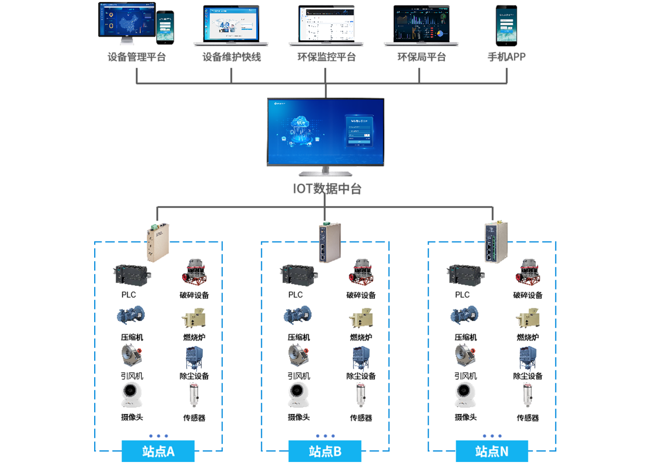 在固废垃圾处理场的各个关键位置(如垃圾存储区、处理设备旁等)安装传感器和监测设备,通过物通博联的工业智能网关采集垃圾处理设备(如焚烧炉、破碎机等)的运行数据(如运行状态、温度、压力等)、垃圾存量数据以及环境监测数据(如空气质量、噪声等)。将采集到的数据传输至固废垃圾处理远程监控平台,平台对数据进行实时分析和展示。当垃圾存量达到预警值或设备出现异常时及时发出预警,支持远程运维和调度操作,同时对垃圾处理效果进行评估。