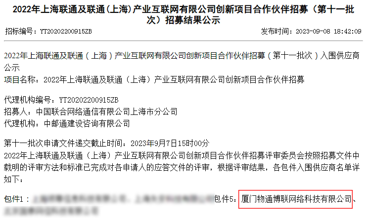 近日,上海联通及联通(上海)产业互联网有限公司创新项目合作伙伴招募(第十一批次)入围供应商名单公示,我司成功入围,物通博联产品将在将在联通供应链平台“公开市场”上架!