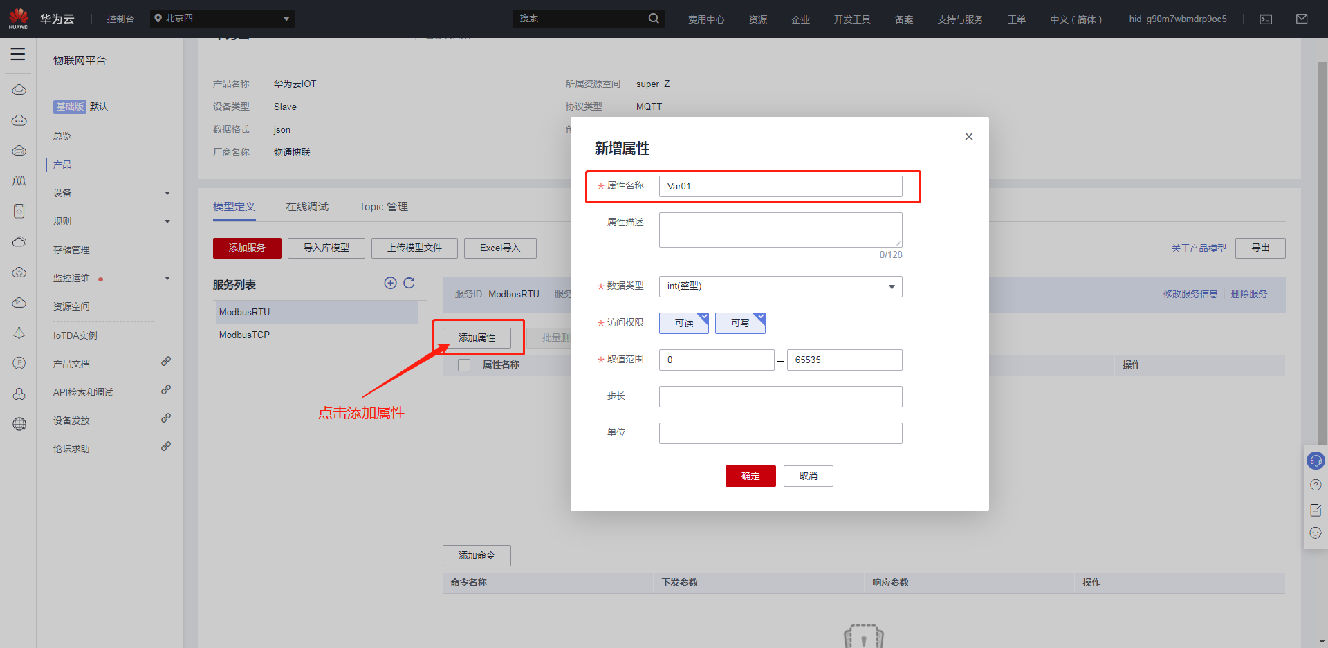 “属性名称”对应的是网关上建立点位的“变量名称”,点击对应的服务ID,在该服务ID下建立属性。