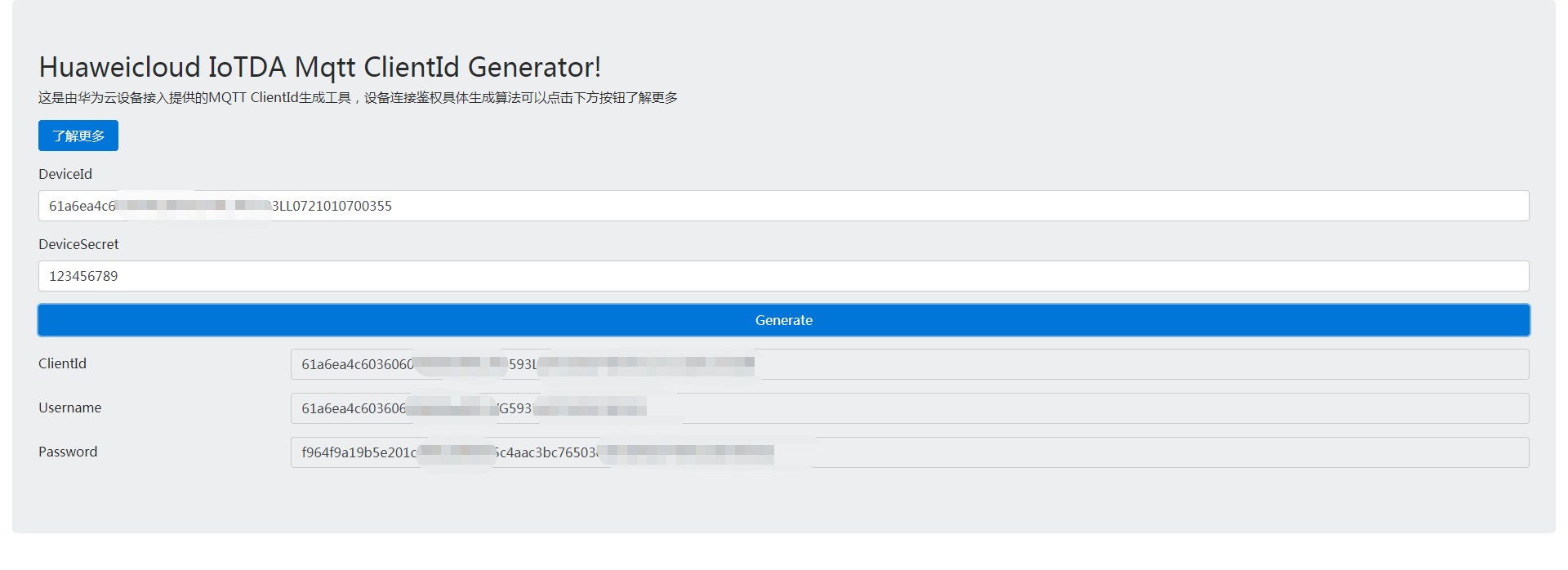 通过以下链接生成连接所需的用户名、密码和ClientID:https://iot-tool.obs-website.cn-north-4.myhuaweicloud.com/