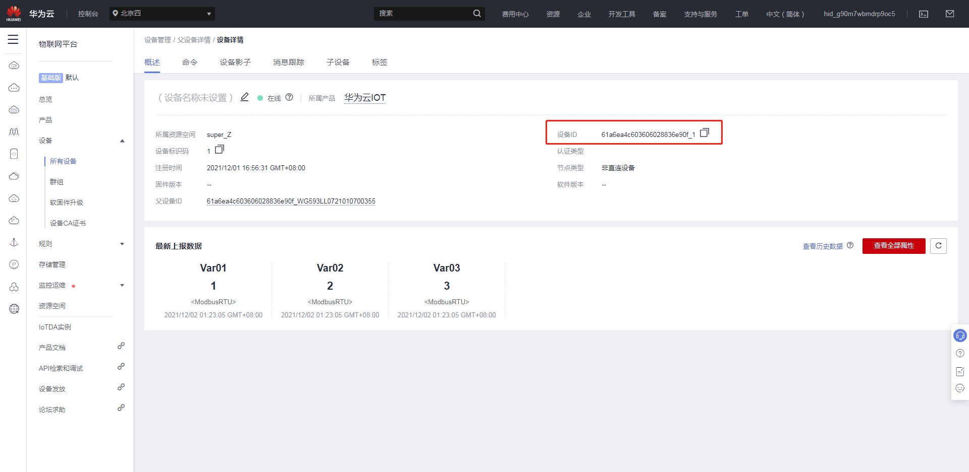 华为云IOT端非直连设备的“设备ID”与网关端变量分组内,虚拟子设备“子设备序号”对应。