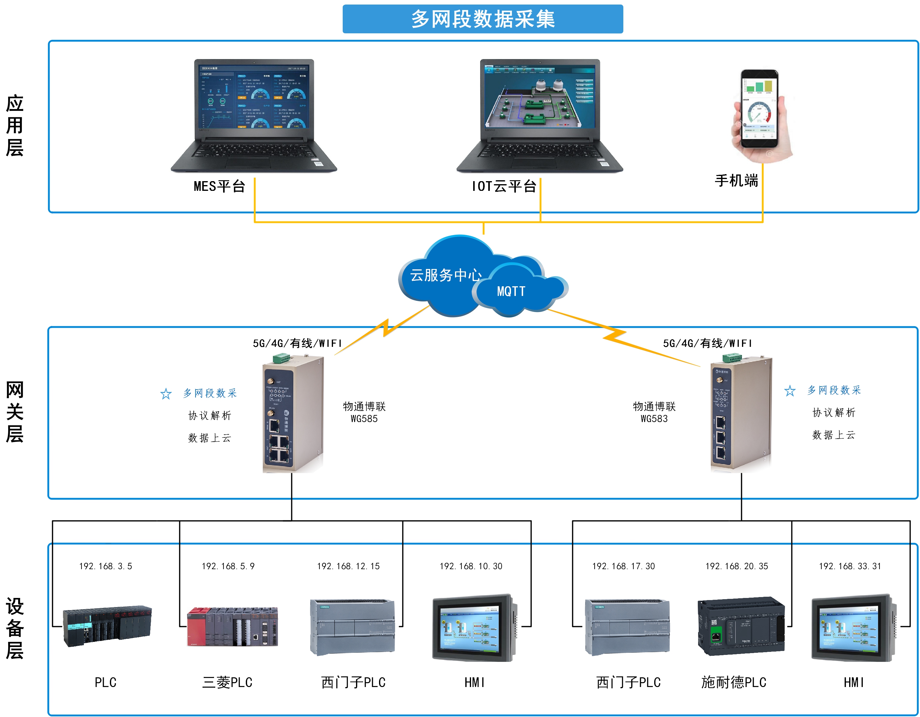 针对这些问题,物通博联公司推出了一款全新的WC系列网段隔离器。该系列产品适用于生产网络对 PLC、HMI、CNC、DCS、MES等网络通讯和数据采集,兼有跨网段隔离和IP转换的功能,车间多个设备,如果有不同网段的IP地址,则可以统一成同一网段的IP地址,进行设备(PLC、CNC)的在线编程、数据采集、远程管理等各种跨网段访问,能够有效地解决企业内部网络中的通信问题、安全问题,保障企业数据的安全性和可靠性。