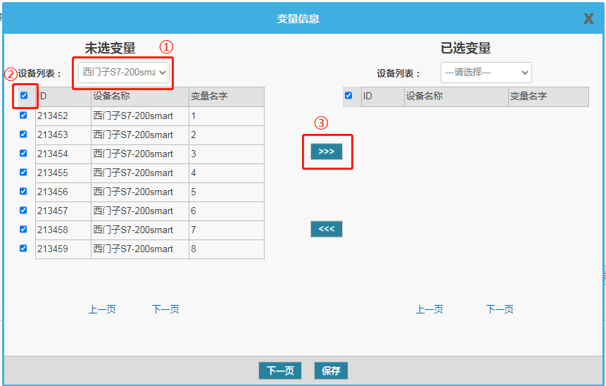从“未选变量”列表中选择对应要转发的设备变量,转到“已选变量”中,点击下一页。