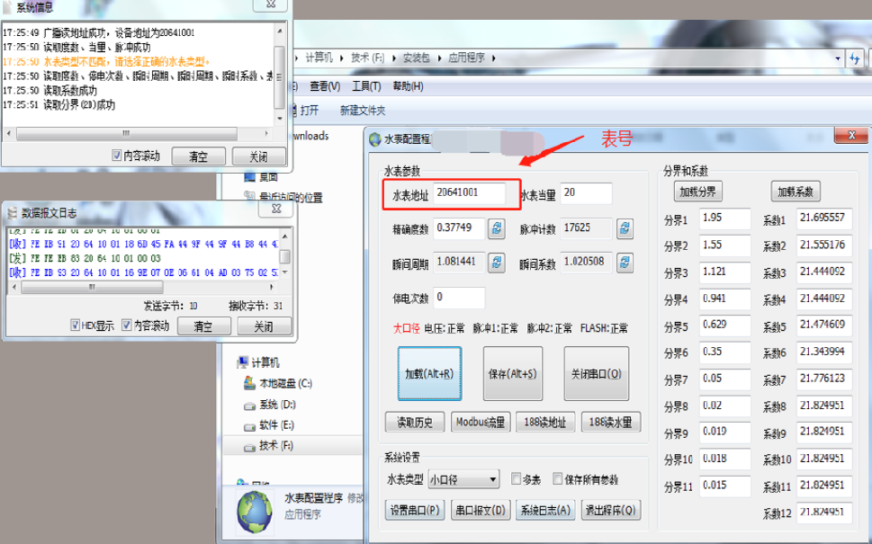 ①水表的串口线通过USB转485线连接到电脑然后打开水表配置工具