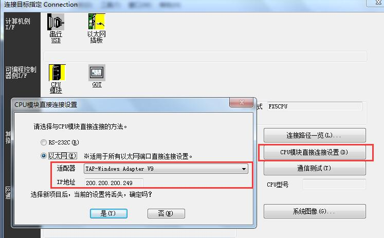 2、“CPU模式”设置,“经由集线器连接”,填写控制器的IP地址。