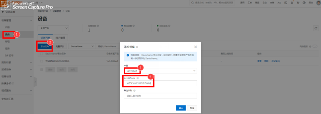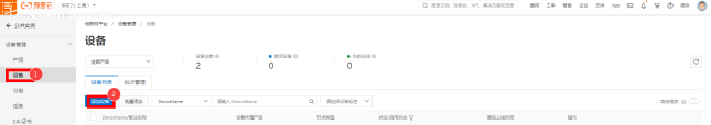 项目生成后,点击“设备管理”选择“设备”,选取右边“添加设备”。