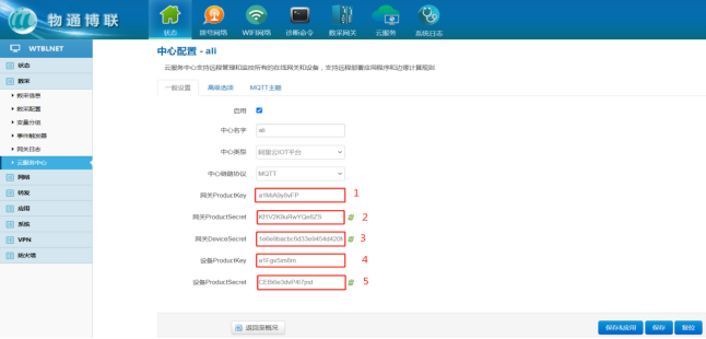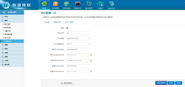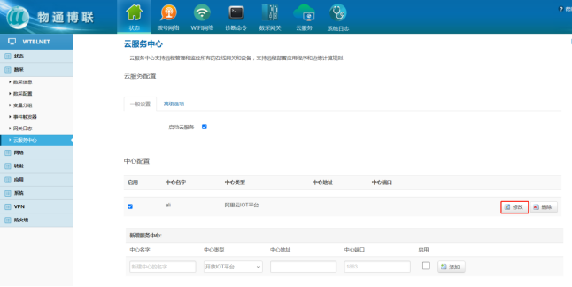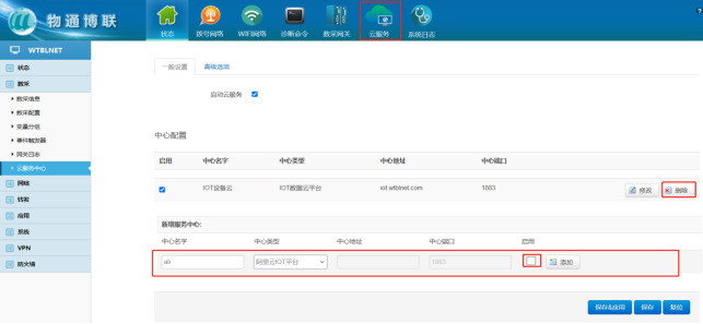 打开物通博联网关WEB界面,可删除原有的服务中心,新建一个连接中心,中心类型选择阿里云IOT平台,启用√ 点击“添加” 保存应用