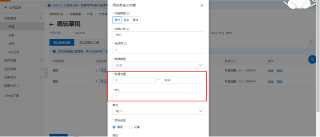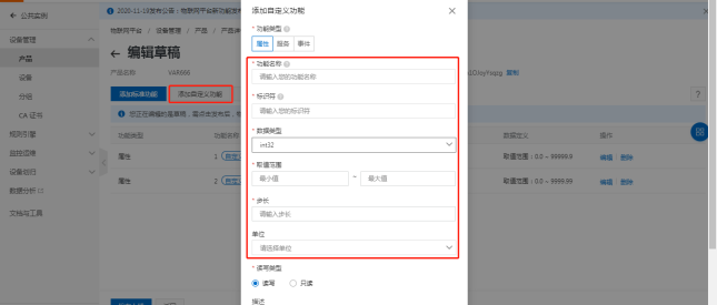 点击产品—节点类型为(设备)—查看—功能定义—自定义功能。(阿里云变量上限只能添加256个)