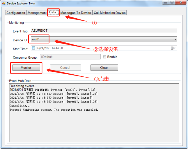 打开配置工具软件,切换到”data”选项卡,再点击”monitor”按钮进行消息接收;