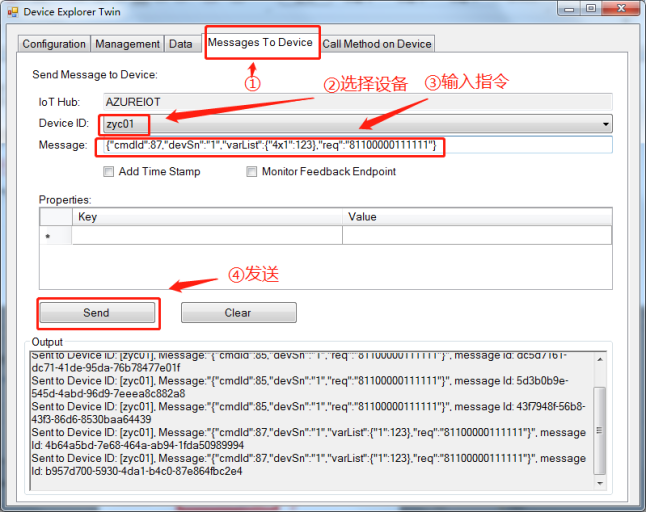 打开配置工具软件,切换到”Message To Device”选项卡,在”Message”输入框,填写要下发的消息