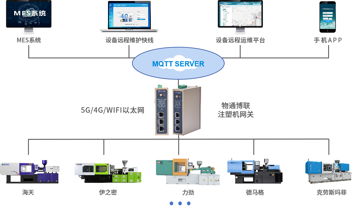 物通博联注塑机网关是一款针对注塑机实现数据采集的设备,主要用于解决注塑机等传统生产设备的数据采集、远程监控和信息化管理问题,网关支持各种注塑机的私有协议和其他工业标准协议(弘讯、科强、KEBA、恩格尔、住友、日精……),可以实现各种注塑机设备联网、数据采集,实时传输注塑机注射压力、油温、模具温度、注射速度等数据到本地服务器、云平台、MES、ERP等等,为制造业数字化转型提供了强大支持。
