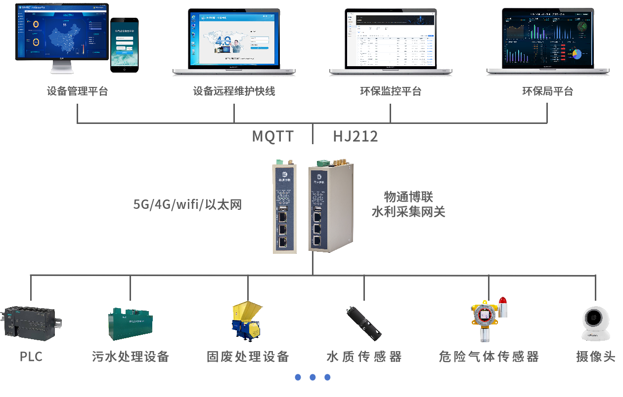 物通博联环保采集网关可以连接各种环保设备、传感器、仪表、IO数据和PLC,通过MQTT协议上传到设备管理平台和通过HJ212协议上传到环保局监控平台,实现设备远程监控和数据分析,为环境监测和管理提供重要的决策支持。