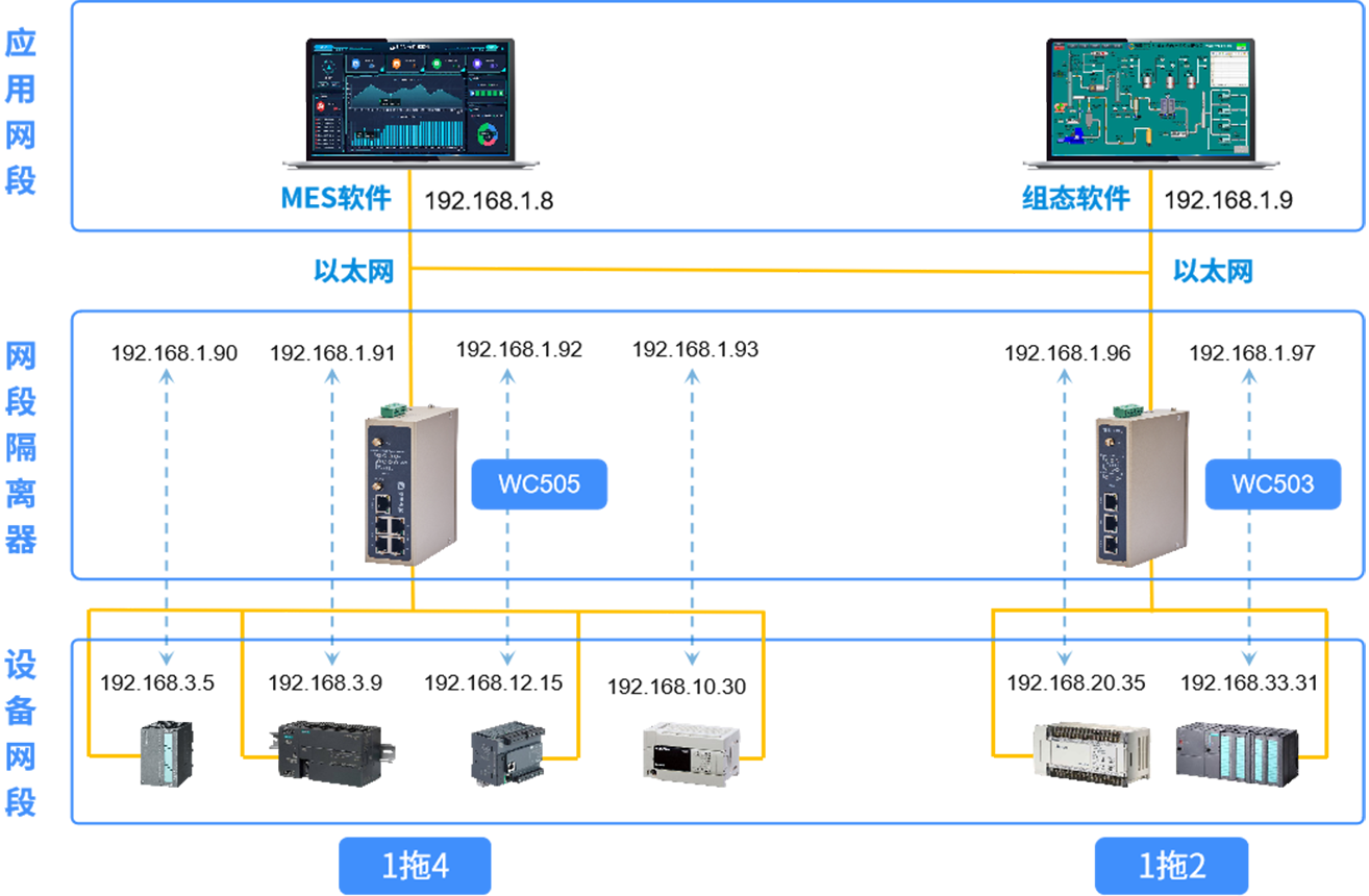 物通博联·WC系列网段隔离器(NAT转换网关)适用于生产网络对于PLC、HMI、CNC、DCS、MES等设备和系统进行网段隔离和IP转换,从而实现设备与设备,设备与系统之间的有效防护隔离,通过IP的转换实现统一化的IP规划;广泛应用于智能工厂、矿山、油井等生产网络设备接入场景。