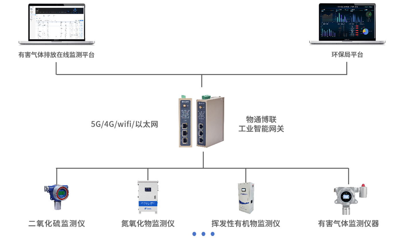在可能产生有害气体排放的区域安装各类有害气体监测仪器(如二氧化硫监测仪、氮氧化物监测仪、挥发性有机物监测仪等),通过物通博联的工业智能网关将采集到的有害气体浓度数据实时传输至有害气体排放在线监测平台。平台对数据进行实时分析和存储,当有害气体浓度超标时立即发出预警,并将相关信息发送给环保监管部门和企业管理人员。同时,平台具备数据统计分析功能,可对排放趋势进行分析、对区域污染情况进行评估,支持远程监管控制和数据共享发布。