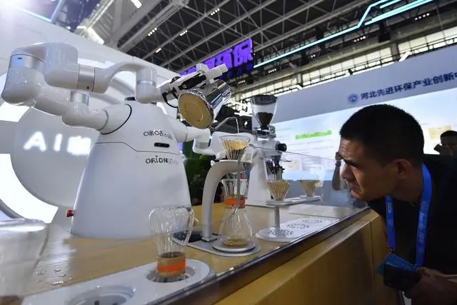 9月6日,参观者在数博会上观看AI咖啡手冲机器人制作咖啡。 新华社记者 骆学峰 摄
