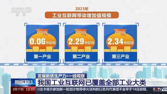 目前,我国有一定影响力的工业互联网平台超340个,连接近亿台套工业设备;融入49个国民经济大类,覆盖全部工业大类;85%的生产线效率明显提升,生产时间缩短20%。2023年,带动三大产业增加值规模达0.06万亿元、2.29万亿元、2.34万亿元,自身核心产业规模达1.35万亿元。