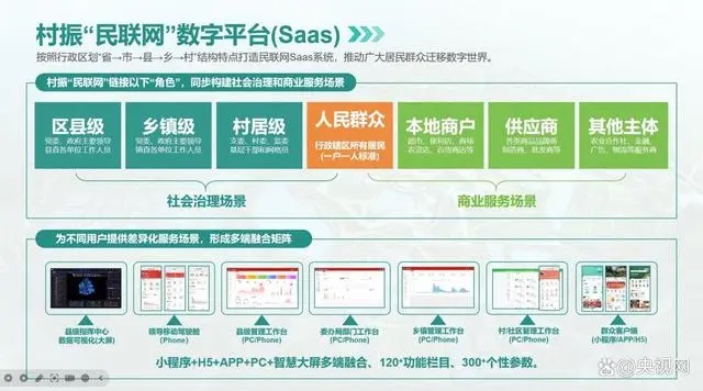 村振民联网数字平台,在全国率先提出“民联网”理念。这一平台力图推动县、乡、村各级治理主体和广大居民群众以户为单位全量从“物理世界”迁移至“数字世界”。平台具有贯通县乡村三级治理主体、紧密连接全域居民群众的核心优势,构建形成“1 + N”乡村数字治理体系,实现涉农数据资源互通共享、数字资源高度集约、乡村治理敏捷高效、应急管理全面多维、内生动力持续增强、经济社会协同发展。目前,这一平台在我国多个地区已有整县复制的成熟案例。