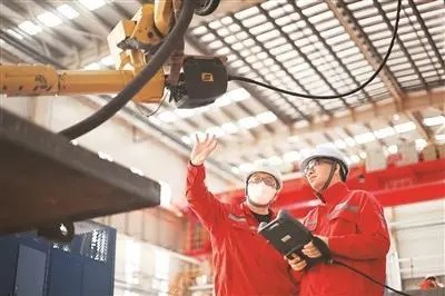 10月30日,工作人员在海油工程天津智能制造基地制管作业车间调试一款焊接机器人。新华社记者 赵子硕 摄