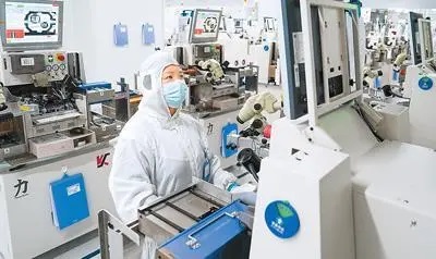 11月3日,在江苏南通如东经济开发区的南通宁芯微电子有限公司,工作人员在装片焊线车间内作业。新华社记者 李博 摄