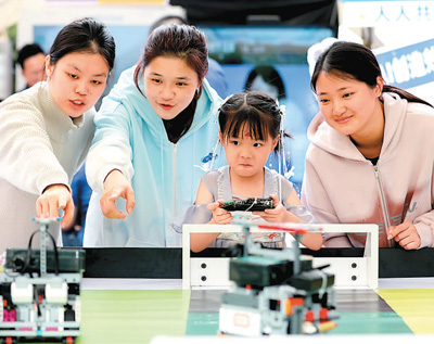 4月28日,在福建省福州市鼓楼区鼓东街道冶山春秋园,小朋友正在体验足球机器人。谢贵明摄(人民视觉)