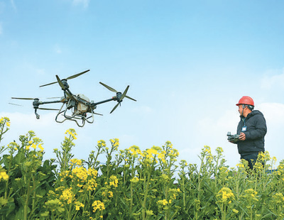 3月6日,江苏省南通市通州区刘桥镇无人农机示范基地,种植户在田间操控调试植保无人机。许丛军摄(人民视觉)