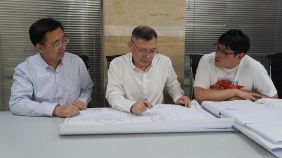龚存忠(中)与团队研讨技术方案。中国船舶集团第七〇四研究所供图