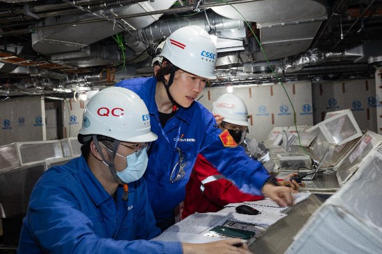 马玲(中)在“爱达·魔都号”集控室对自动化系统调试状态进行确认。外高桥造船供图