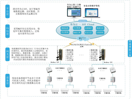 通过 RS485、RS232、以太网等多种接口,物通博联工业智能网关能连接新风设备控制器 PLC、温湿度传感器、空气质量传感器、风量风压传感器等设备,实时采集设备运行状态、环境参数等数据。随后利用 5G、4G、WIFI、以太网等通信方式,将采集的数据安全、稳定、高速传输至智慧楼宇管理系统中,为用户提供可视化界面,实现设备远程监控、数据分析、故障告警、远程控制等功能。