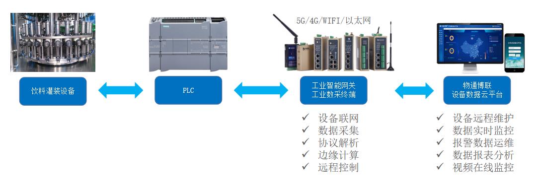2、传输层:工业智能网关接入PLC,实时采集以上重要参数并进行边缘计算,随后通过4G/5G/以太网将数据加密上传至云端/本地服务器的物联网平台中,具备断点续传、多网互备等功能。