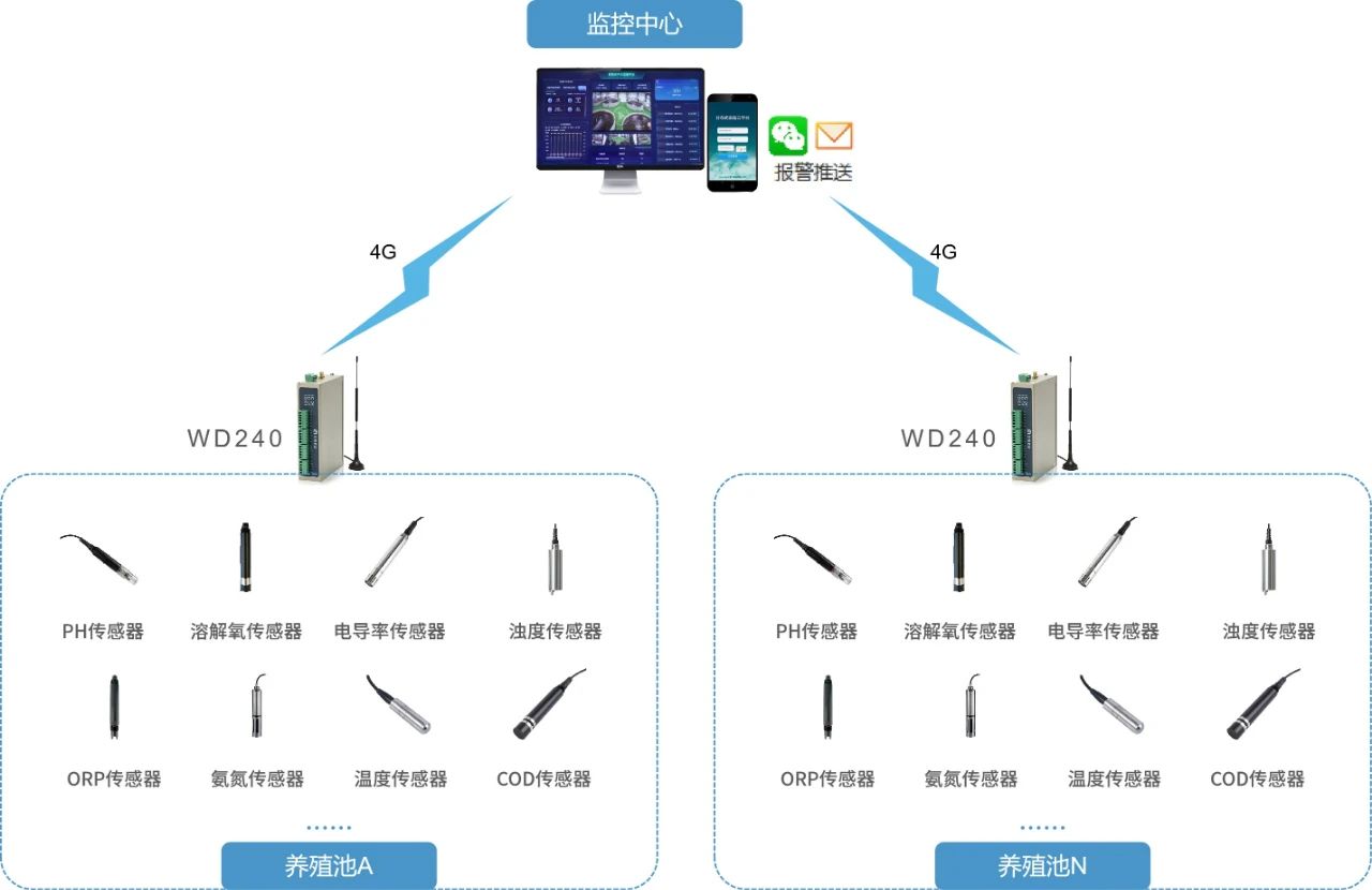 4、远程控制:出现异常自动告警,并能设置增氧机、水泵等控制指令,保证水中的含氧活性,提高工作效率与管理水平。