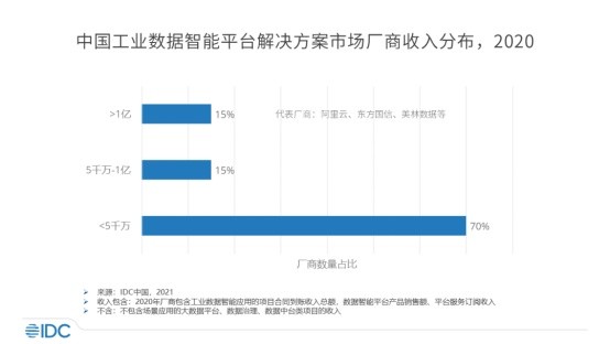 目前厂商布局大多集中在业务流程相似度高、付费能力强、数据基础好、工艺复杂的能源电力、石油石化、装备制造、钢铁、半导体等少数行业,多数厂商选择重点布局2-3个行业或场景。由于项目难度大,周期长,多数厂商年收入在5千万以下,市场格局未来变数较大。重点子市场——平台解决方案市场,2020年,市场总规模15.98亿元人民币,同比增长42.9%。