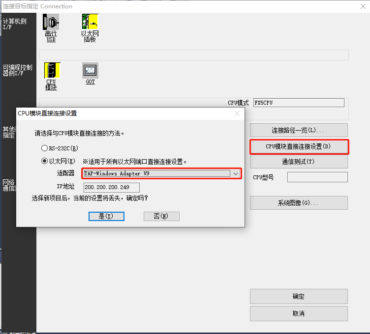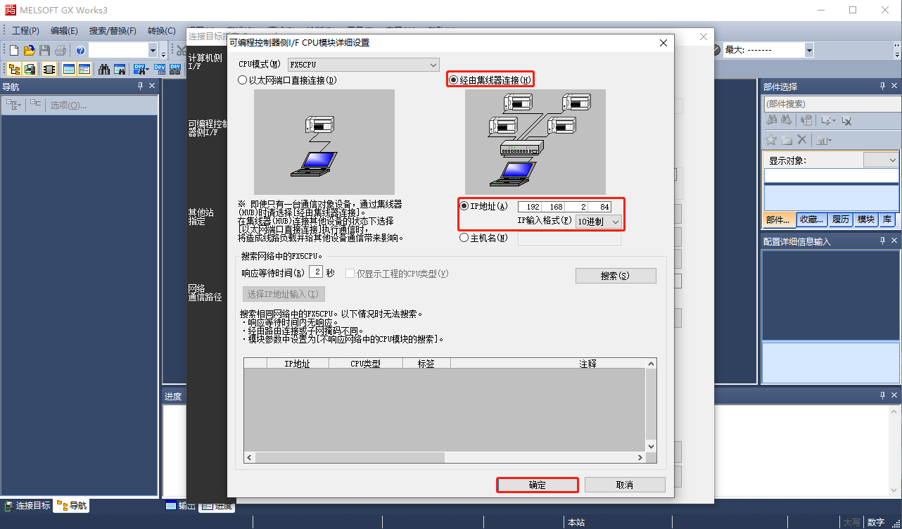 3、“CPU模式”设置,“经由集线器连接”,填写控制器的IP地址。