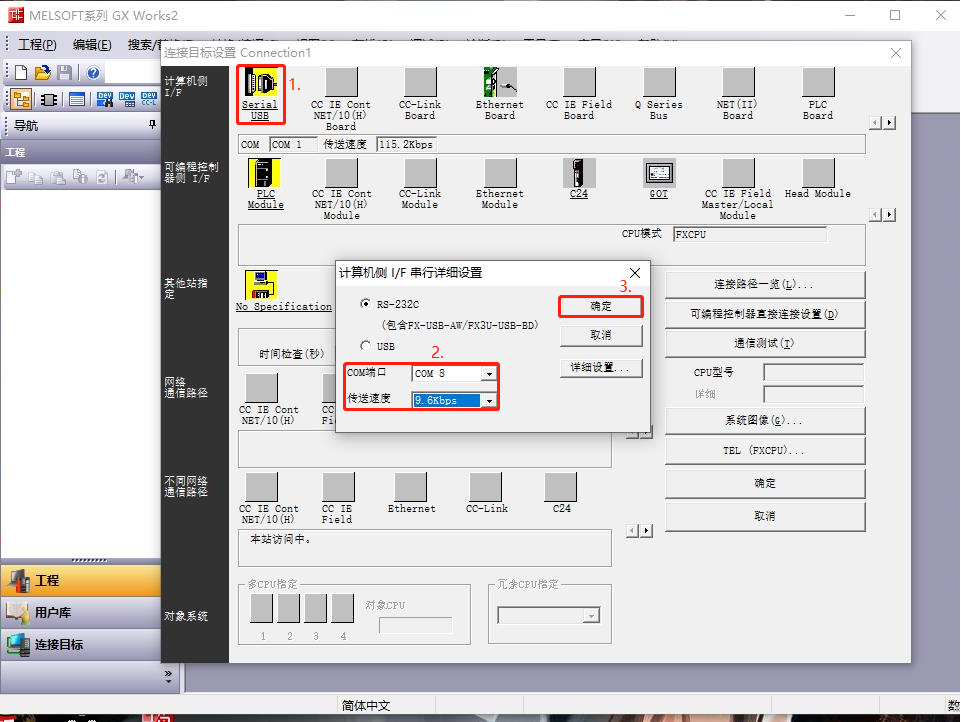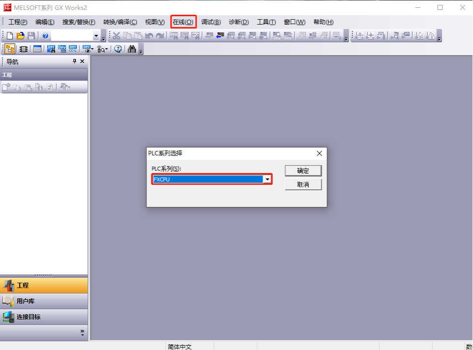 打开 MELSOFT系列 GX Works2,登录 FX3UPLC,设置 FX3U 串口参数,点击“在线”——“PLC读取”——“模块参数”,具体设置见下图: