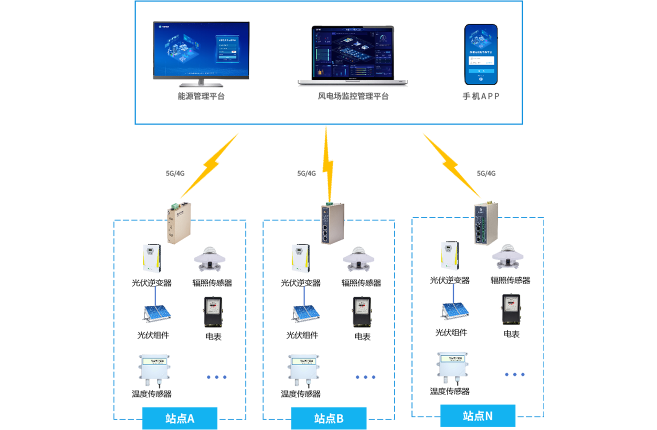 分布式光伏电站通过物通博联的工业通信网关将采集到的光伏数据(如发电量、设备温度、辐照强度等)传输至光伏监控管理平台。平台对数据进行分析,实时评估发电效率,监测设备状态,当出现故障时及时预警并提供故障诊断和处理建议,同时支持远程运维操作和能源优化调度。