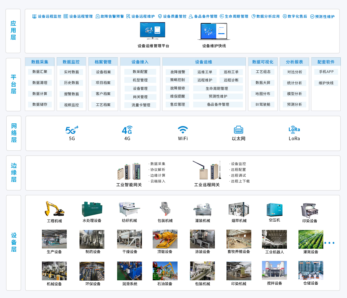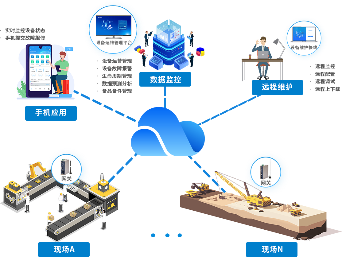物通博联针对设备制造商的装备数字化需求,构建了“终端数据采集-多网融合传输-云端智能运维-远程协同服务”的全周期技术解决方案:以工业智能网关为核心,采集装备运行参数、运行状态等数据,通过 5G/4G/WiFi/ 以太网等方式将标准化数据实时上传至设备运维管理平台。平台借大数据分析与故障诊断算法,实现数据监控、趋势预测与异常识别,设备存故障风险时自动触发预警。依托设备维护快线,可远程完成程序上下载、参数调试等操作,提升维护效率、降低运维成本,助力设备制造商实现装备全生命周期数字化管理。