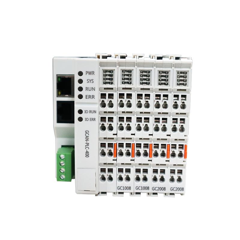 从图中我们可以看出,PLC的上面集成有若干个IO接口,分为输入接口和输出接口两种。其中,输入接口是用于采集外部数据,输出接口是把PLC的控制指令输出出去。除了IO接口以外,设备左侧的那些接口其实也非常的显然,它们都是设备的通讯接口,有串口类型,以太网网口类型以及CAN接口类型。