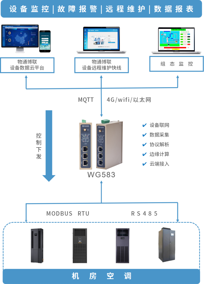 物通博联推出的机房空调数据采集方案,是基于物通博联工业智能网关WG583和物通博联IOT云平台,实现机房空调数据采集、云端组态、故障报警和远程控制,并在微信小程序进行管理和查看,有效提升设备管理效率。