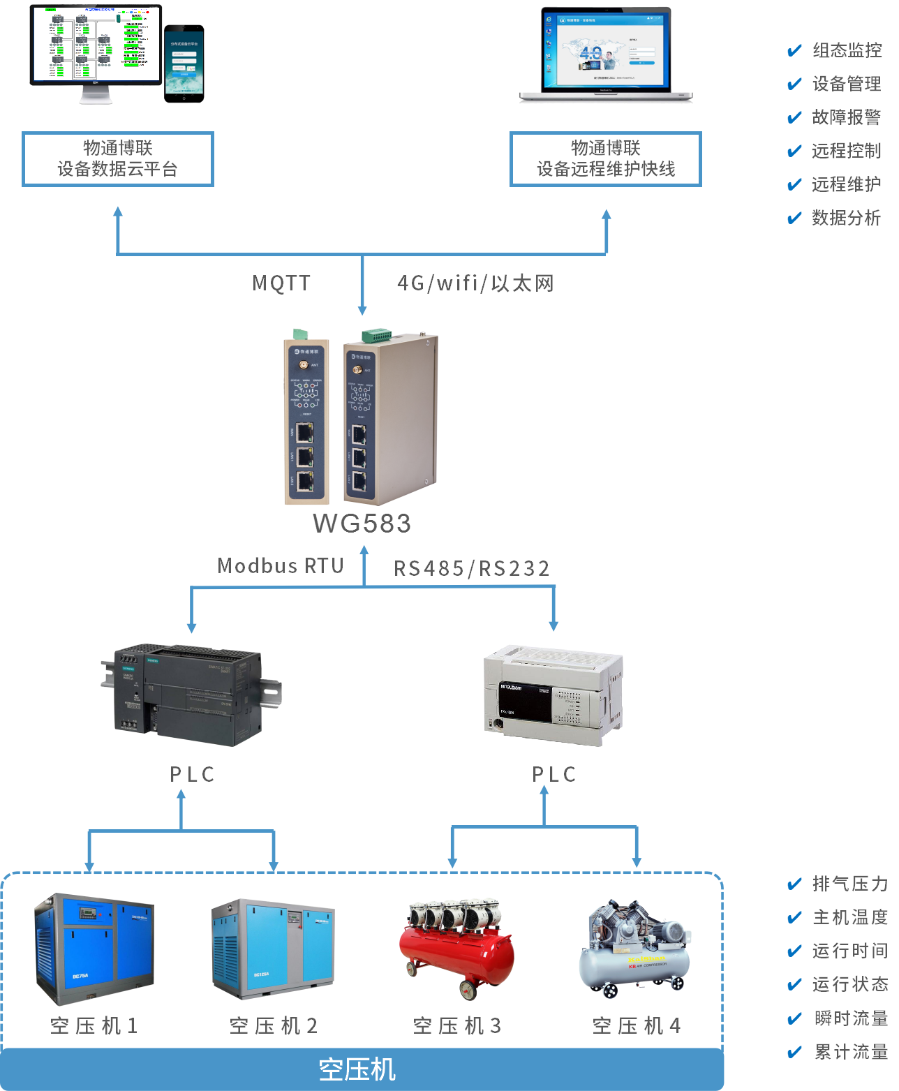 物通博联推出的食品空压机数据采集远程监控系统由工业智能网关WG583和物联网平台组成。工业智能网关WG583通过与空压机PLC通信,实现实时数据采集和传输;云平台与工业智能网关实时通信,实现主机温度、排气压力、瞬时流量、累计流量等数据以及空压机运行状态、运行时间的可视化展示与组态监控;移动端通过在云平台查看调取数据并接收报警信息,就能及时采取措施管理控制与远程维护,保证空压机运行稳定可靠,避免计划外的?;鹗?。