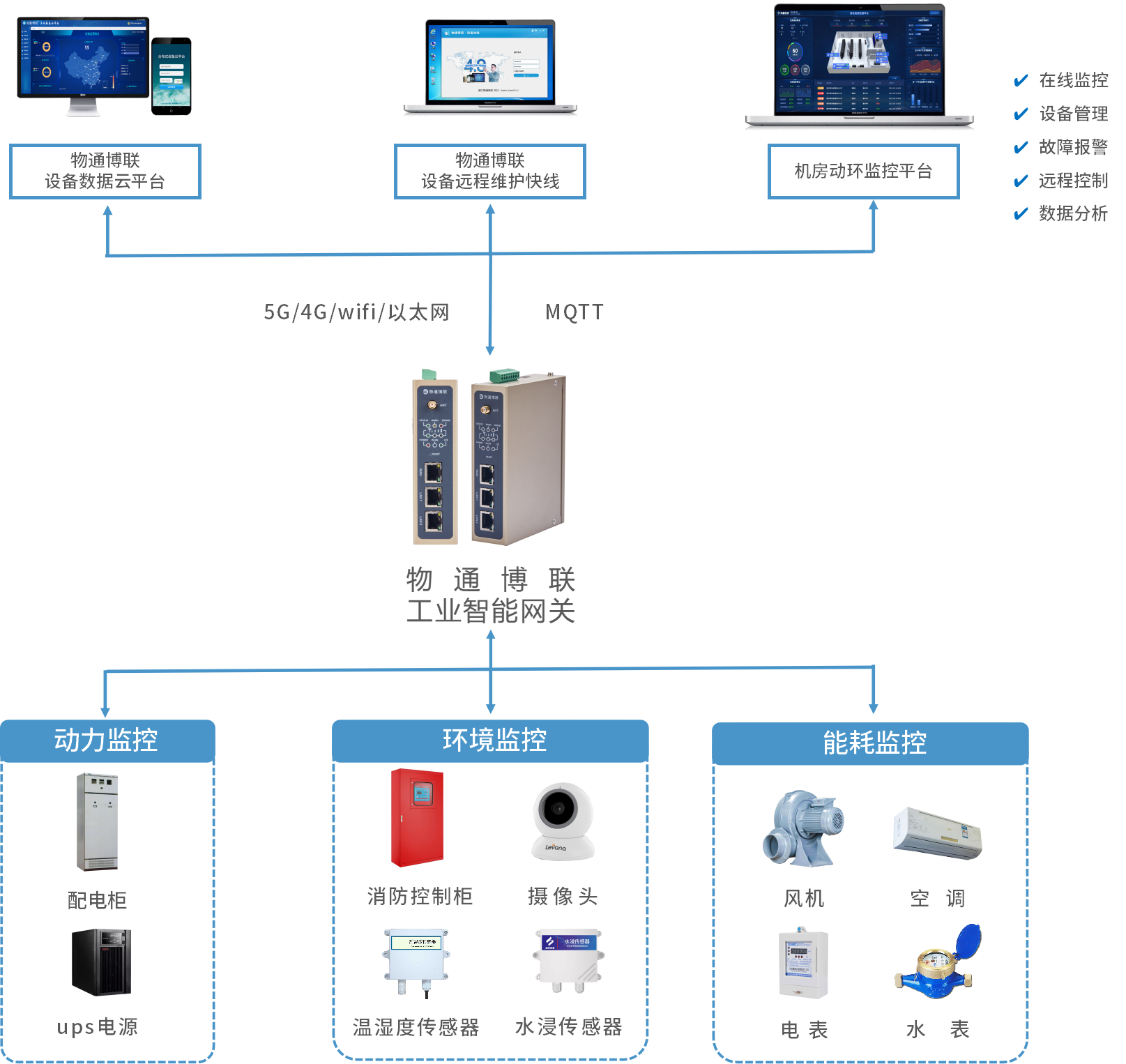 物通博联推出的机房动环在线监测系统由工业智能网关和物联网云平台组成。物通博联工业智能网关可以快速接入机房动环设备(配电柜、温湿度传感器、ups电源、蓄电池、空调、风机、摄像头等)实现一体化的数据采集、规则报警、远程监控等功能。采集到的数据支持通过5G/4G/WIFI/以太网等上网方式,将数据传输到物通博联云、企业私有云、阿里百度华为等第三方云以及本地上位机软件。