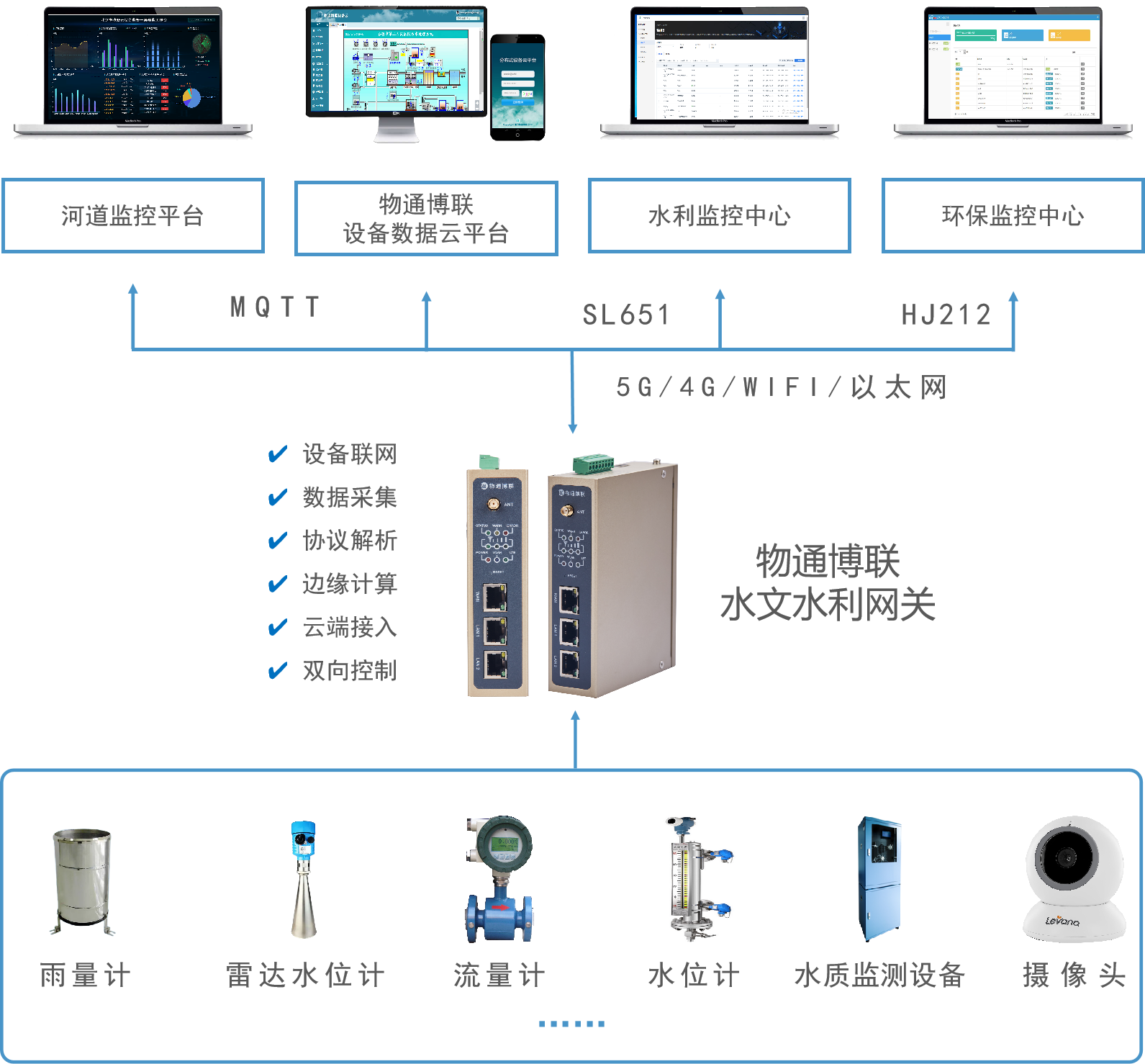 网关可以接入流量计、流速仪、雨量计、水位计、水质监测仪、摄像头等设备,进行实时数据采集并提供5G/4G/WIFI/以太网等通信方式,实现全天候7*24小时自动化工作。