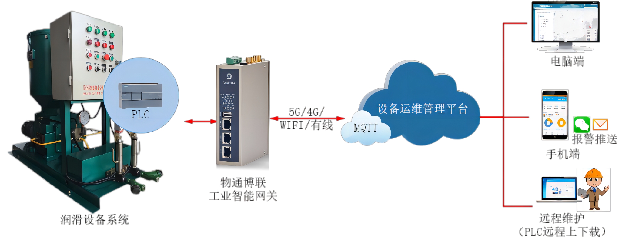 依托工业物联网、大数据和云计算技术,物通博联提供“工业智能网关+数据云平台”的解决方案。通过工业智能网关把分布在各个地区的润滑设备连接起来,对润滑设备PLC进行数据采集并通过5G/4G/WIFI等方式上传到云平台,实现手机端/电脑端/云组态对设备和项目的监控和管理。