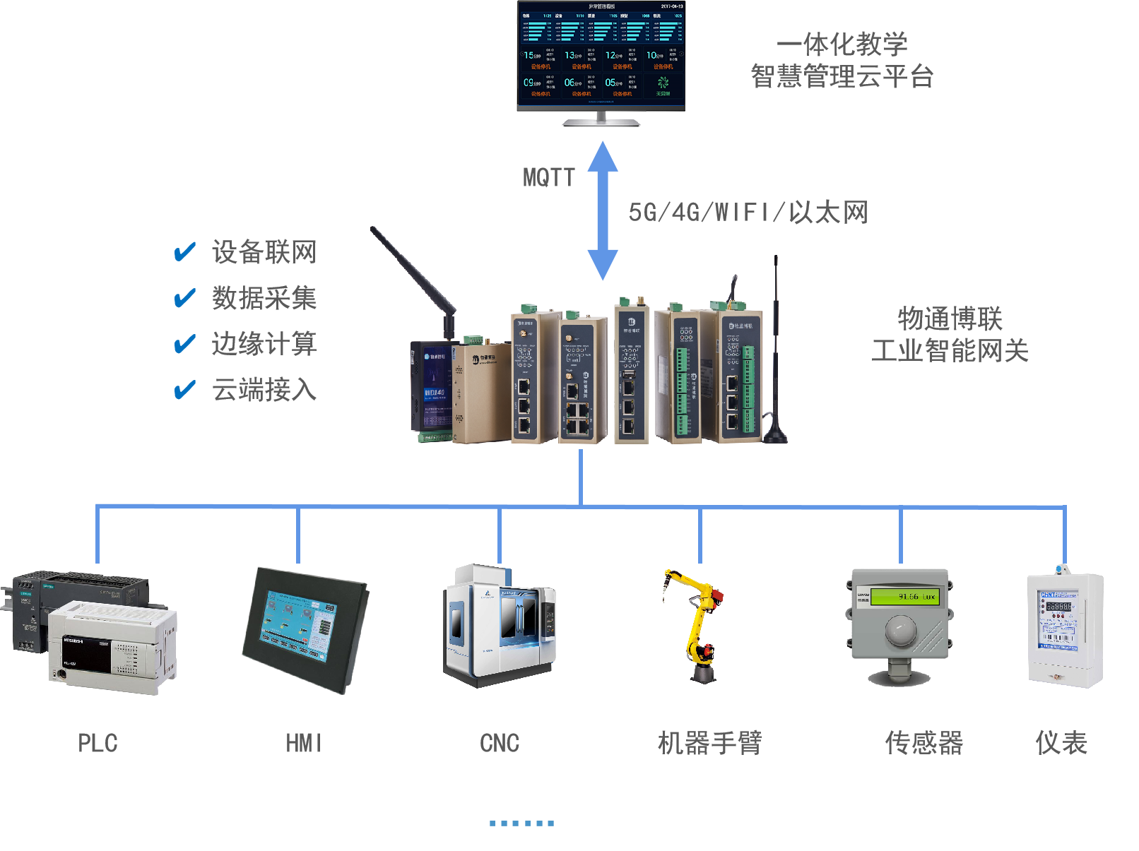 物通博联WG系列工业智能网关是一款两化融合和边缘计算网关,具有丰富的物理接口,如RS232、RS485、以太网口、IO接口等,与实训平台的各种工业设备连接,解决接口不统一问题,内嵌丰富的工控协议和智能采集算法,实时采集设备数据,网关支持各种边缘计算功能如智能采集、数据过滤、报警计算、跳变触发、公式计算、分组策略、定时任务、算法开发等,通过对设备的模型建立和数据标准化后,将数据通过MQTT协议上传到一体化教学智慧管理云平台,帮助平台实现各类工业设备数据的无缝接入、高效整合与精准应用,为提升实训效果提供了强有力的技术支撑。