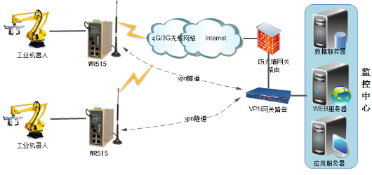 监控中心端采用ADSL/光纤接入Internet 公网,获取固定公网ip。搭建vpn服务器。物通博联工业无线路由WR515做vpn客户端和服务器建立vpn隧道,实现两端内网互通。数据库服务器上运行采集系统,可以采集工业无线路由WR515下接的以太网plc数据以及工业机器人数据,从而达到采集监控工业机器人运行状态目的。