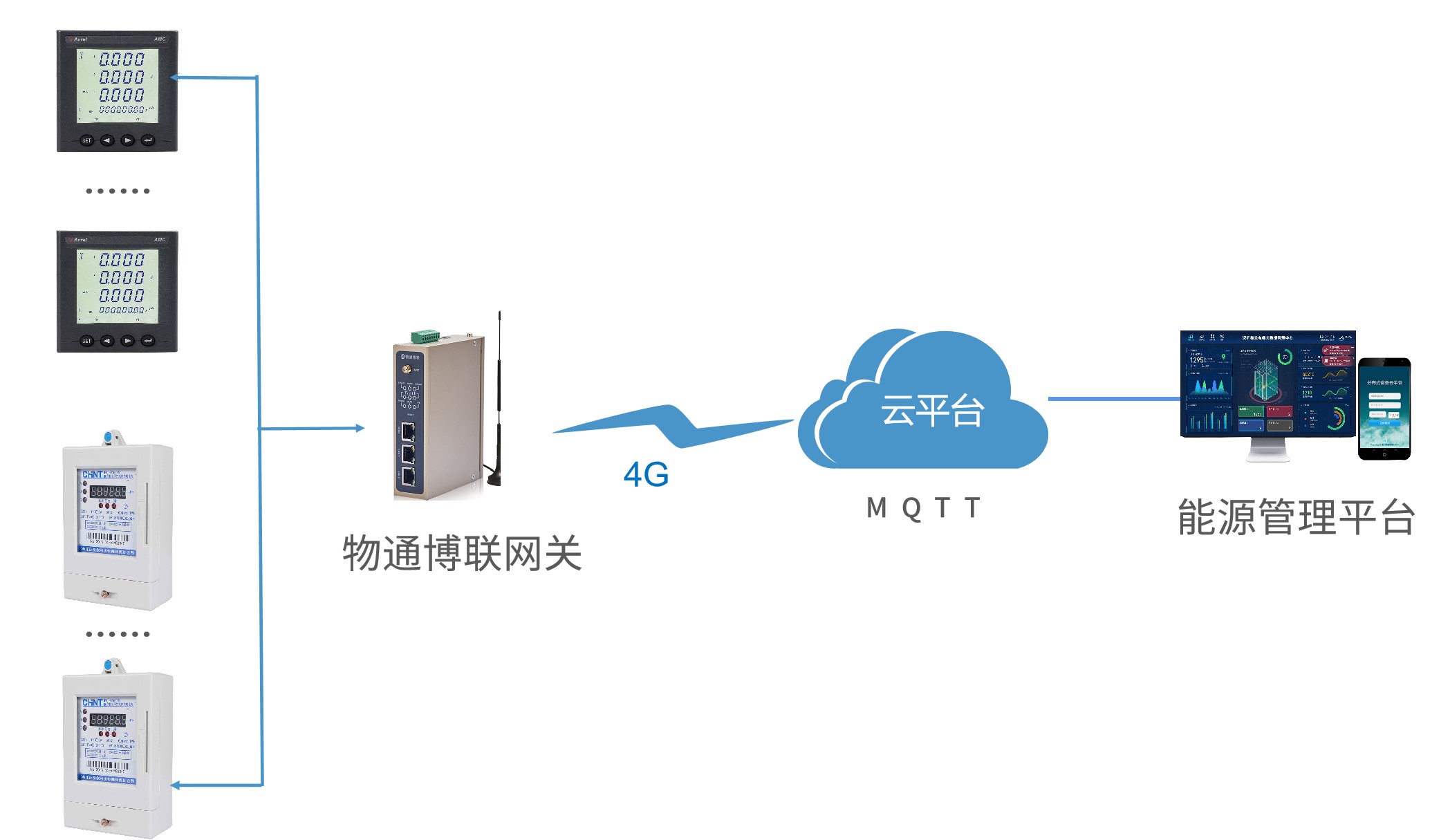 物通博联提供产业园区电力能耗数采监测物联网解决方案。通过将物通博联·工业智能网关部署到各个配电室现场,与电表RS485串口通信连接,能够实时采集电力能耗数据并通过4G网络传输到智慧园区能耗管理平台中,实现能耗远程监测、自动预警、成本核算、运维管理、数据分析等功能,为减少能耗成本、提高节能水平等提供可靠决策支持。