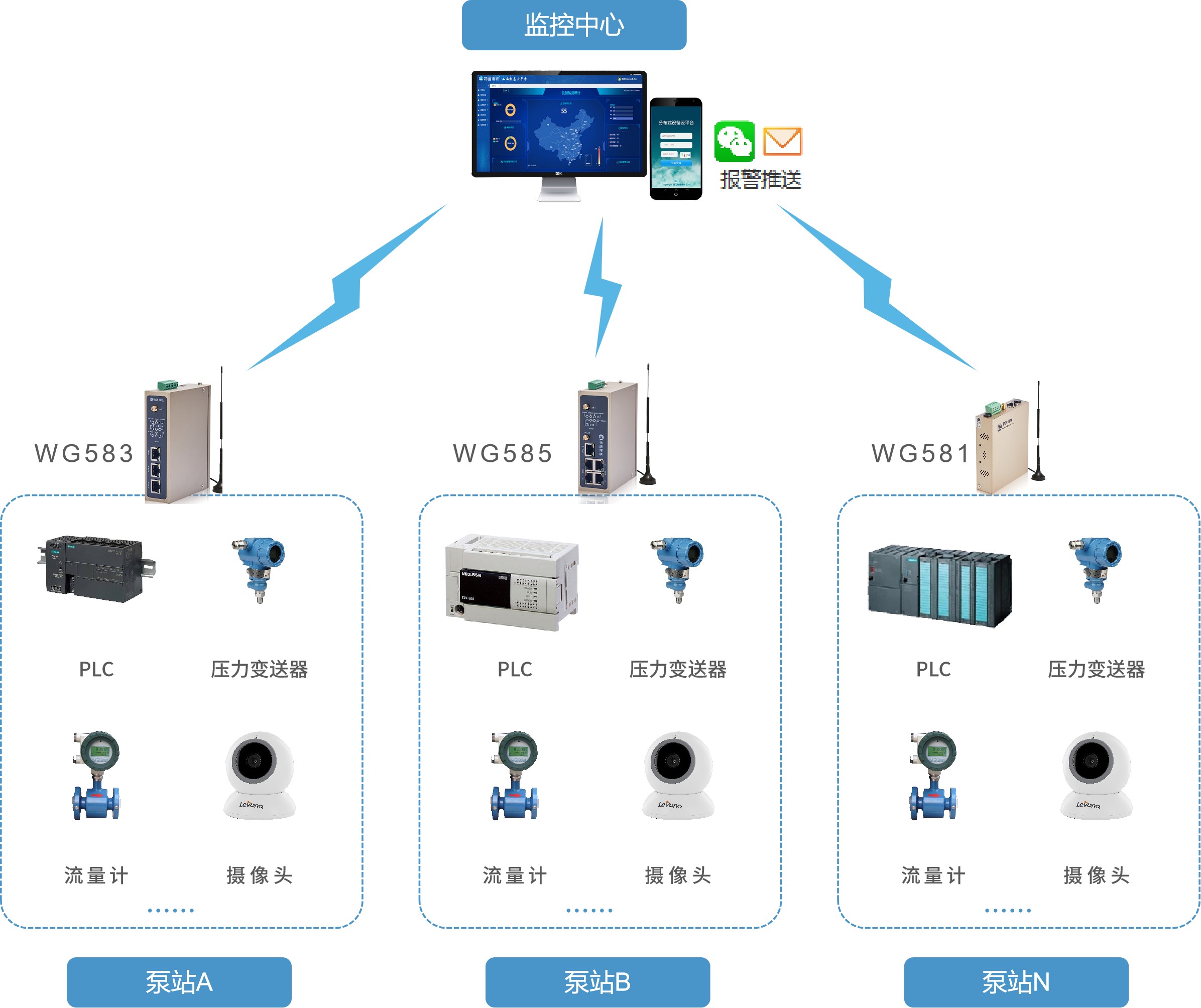 通过接入水泵控制柜PLC、压力计、流量计、摄像头等设备,物通博联水利监测网关能够实时采集水泵阀门的运行状态与工艺参数、管网水压及流量、现场视频等数据,并通过5G/4G无线网络上传到泵站监控管理平台中,从而实现远程监控、自动告警、远程控制、运维管理、远程维护多种功能,从而为泵站巡检运维与数据分析等工作提供全面可靠的数据支持,助力做出科学合理决策,有效加强泵站管理水平,保障取水安全。