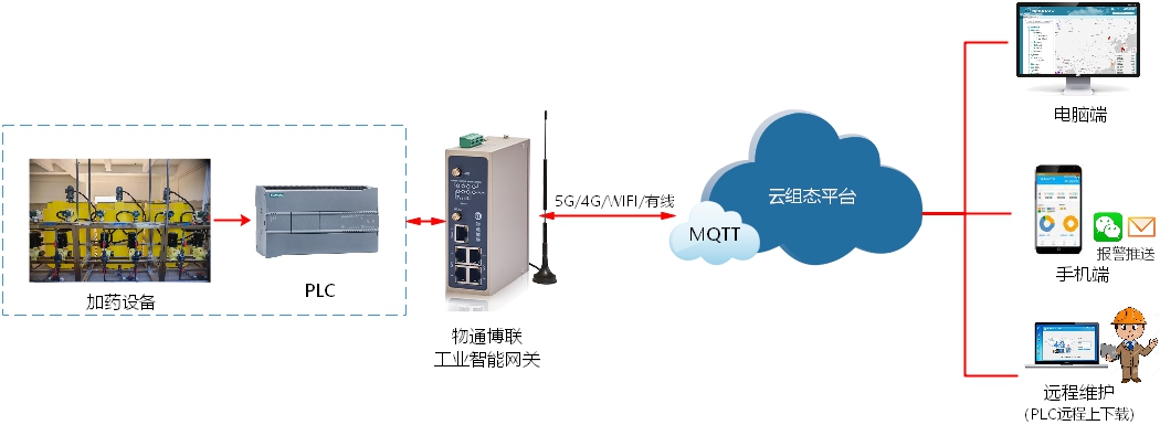 物通博联提供污水处理加药设备云组态远程监控系统方案。通过将物通博联工业智能网关接入加药设备控制器 PLC,实时采集数据并通过5G/4G/WIFI/以太网等网络对接到物通博联云组态平台中,进行编辑绘制搭建组态大屏,从而直观展示污水处理加药设备的运行状态与工艺参数,并在出现异常时自动告警,从而灵活运用远程控制、远程维护、数据分析等手段,提高工作效率并减少人工成本,保障污水处理工作安全、高效开展。